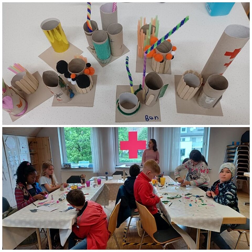 Nachdem letzte Woche im JRK fleißig und mit vollem Elan Müll gesammelt worden ist, gaben wir heute Wegwerfprodukten wie leere Klorollen eine neue Aufgabe und sie wurden gestaltet und zu einem Tischorganizer umgewandelt. Neben Gruppenabende an denen Erste-Hilfe kindgerecht erklärt wird, stehen auch gesellschaftliche Dinge auf unserem Plan für die Gruppenabende. Unsere nächsten Gruppenabende finden an folgende Tagen mit folgenden Themen statt. Am 17.05. dreht sich alles um die Geschichte des Roten Kreuz und am 24.05. werden wir die Gruppe in Erster Hilfe weiterbilden.